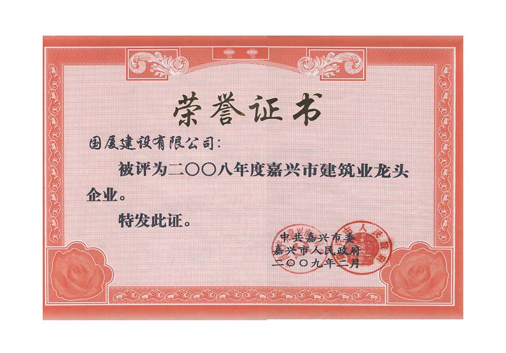 2009年2月,公司荣获“2008年嘉兴市建筑业龙头企业”