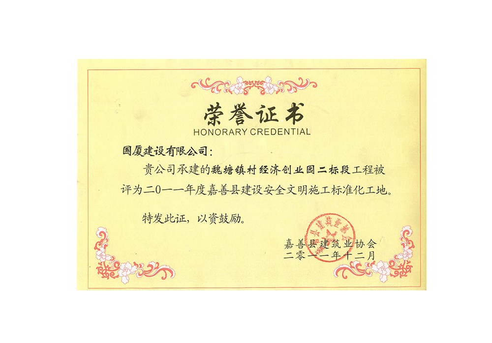 2011年12月,魏塘镇村经济创业园荣获“2011年度嘉善县建设安全文明标化工地” -